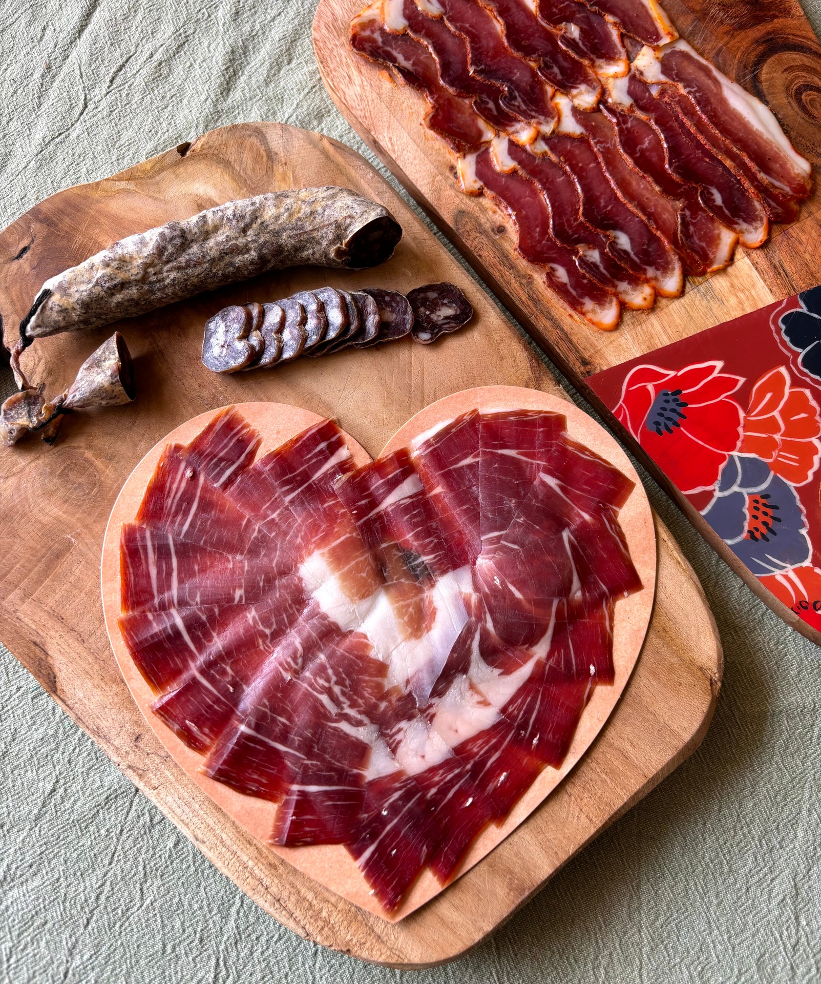 Elégamment présenté sur son assiette en forme de coeur, nous vous proposons 80g de jambon Noir de Bigorre AOP 24 mois coupé au couteau.